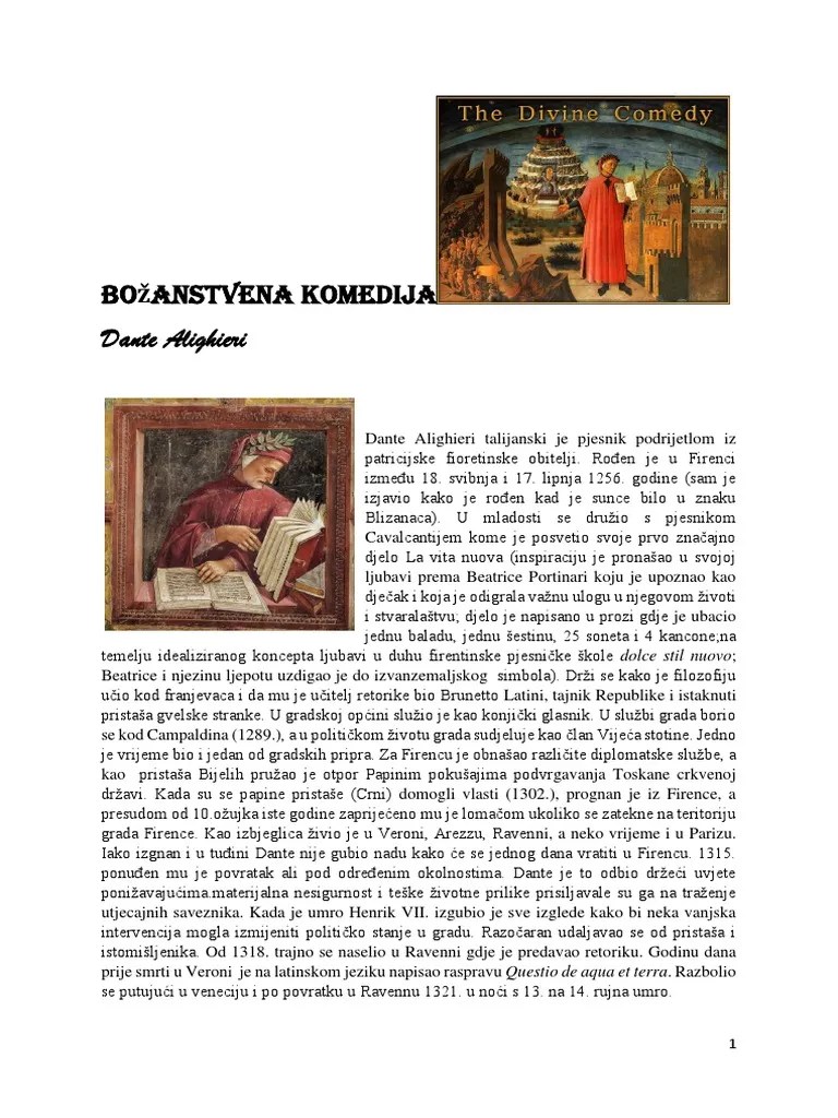 Dante je ostavio niz dela u kojima iznosi svoje filozofske i političke poglede i razmatranja o italijanskom književnom jeziku.. Godine bio prisiljen do smrti živjeti u progonstvu. Poznati italijanski pisac bokačo, pesnik petrarka i dante čine fantastičnu trojku italijanske književnosti. Godine (ne zna se sa sigurnošću da li je bio 25.3. Aktivno je učestvovao u političkim borbama između gvela i gibelina, te je po pobedi neprijateljske strane 1302. Spašava ga vergilije koji objašnjava danteu da mora proći kroz pakao, čistilište i raj, a on će ga voditi kroz prvi dio, pakao. Ili 8.4.) mesto radnje:mračna šuma, pakao tema:izvršenje božje pravde, danteov put kroz pakao ideja:svakog čoveka će sustići kazna za grehe koje je uradio u životu. Pisano je tercinama, a svaki dio sastoji se od 33 pevanja, pa tako celo delo, zajedno s uvo.
